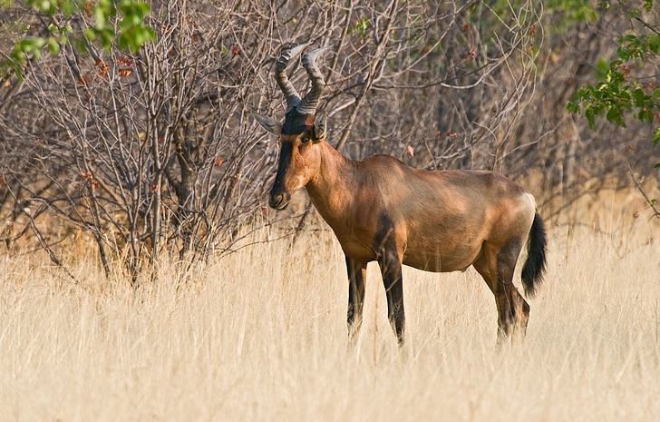 Both male and female Red Hartebeests have curved, ringed horns arising from one short, central horn